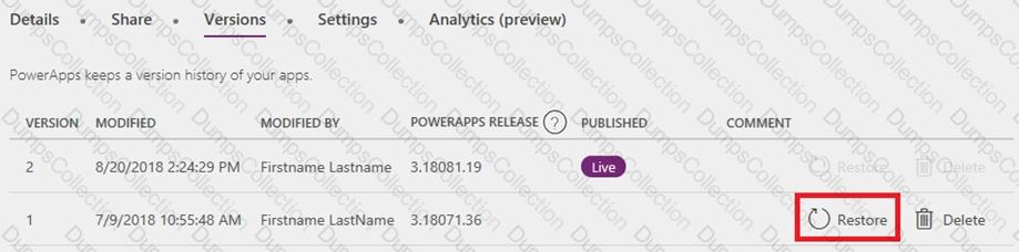 You have a Power Apps app. You create a new version of the app and then publish the new version. A customer goes through the process of restoring the previous version of the app. In the Version tab for the app, you will see two versions of the app.