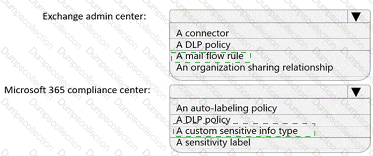 What should you create in the Exchange admin center and the Microsoft 36.S compliance center? To answer, select the appropriate options in the answer area.