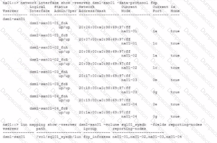 You have a 4-node ONTAP cluster and use FCP to access several LUNs. You perform a volume move to move a LUN (/vol/sql01_sysdb/lun) from node na01-01 to na01-03. After the move, you perform an HBA rescan from the host, but ALUA Is now seeing twice the number of paths to the LUN.