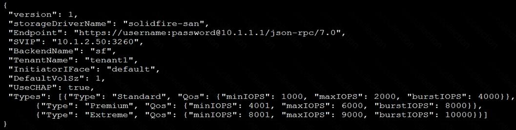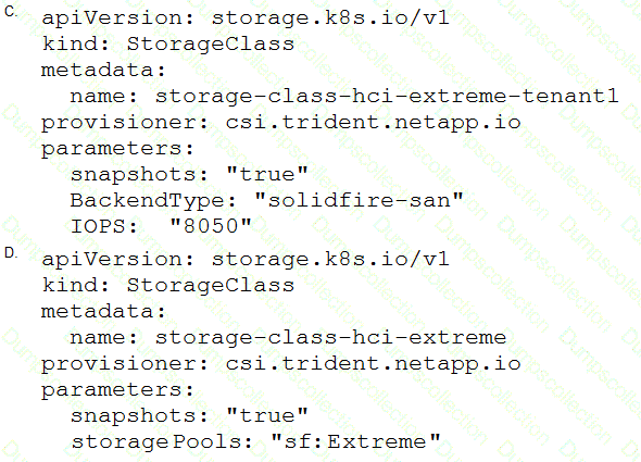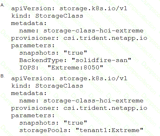 You are setting up a containerized environment with persistent storage. Trident has been installed, and the Trident back end for NetApp SolidFire has been created by using the tridentctl command. Now, you need to deploy an application that requires an Extreme class of service.
