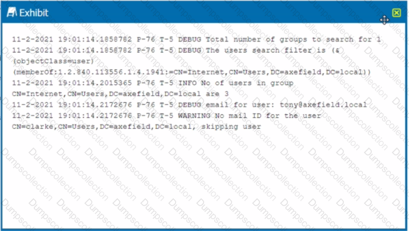 You are troubleshooting a Netskope client for user Clarke which remains in a disabled state after being installed. After looking at various logs, you notice something which might explain the problem. The exhibit is an excerpt from the nsADImporterLog.log.