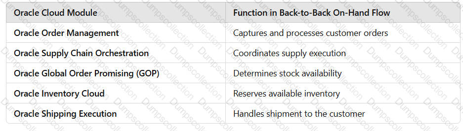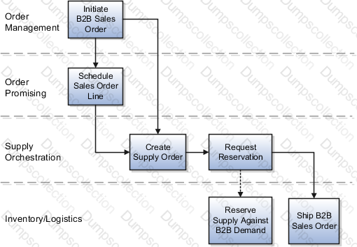 The back-to-back on-hand available (ATP) flow is the simplest in terms of the number of steps that constitute the flow. This flow occurs where on hand supply is available in the fulfillment warehouse for the ordered back-to-back item at the time of order promising. Because on-hand goods already exist in the form of on hand, Oracle Supply Chain Orchestration directly sends a request to reserve the on hand quantity against the back-to-back sales order. You can ship the sales order immediately after the reservation is created.