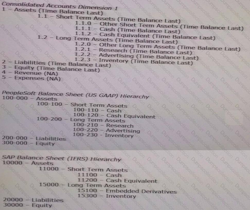 Your organization has two ERPs: PeopleSoft (PS) and SAP. Each ERP has its own chart of accounts. Each chart of accounts is mapped to a consolidated chart of accounts. The Finance department maintains the consolidated account hierarchy.