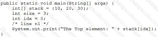 Which code fragment, inserted at line n1, prints The Top element: 30?