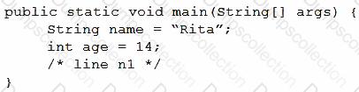 Which code fragment, when inserted at line n1, enables it to print Rita is 14 years old?