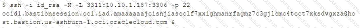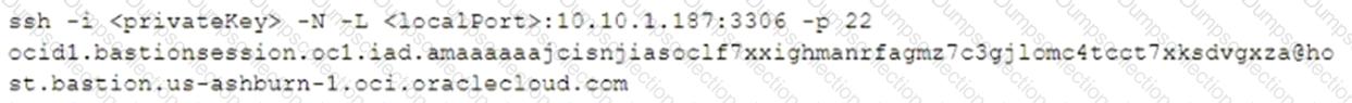 A port-forwarding Bastion session has been created for a MySQL DB system listening on 10.10.1.187:3306. The SSH command provided by the Bastion session is:
