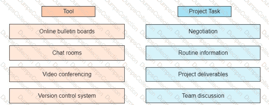 An agile team is geographically separated across multiple continents, and the project manager of identifying the tools to manage the communication among the virtual teams Drag the appropriate tool on the left to each project task on the right