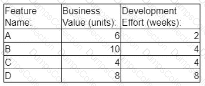 The following table shows the business value created and the development effort required to implement various features in a product