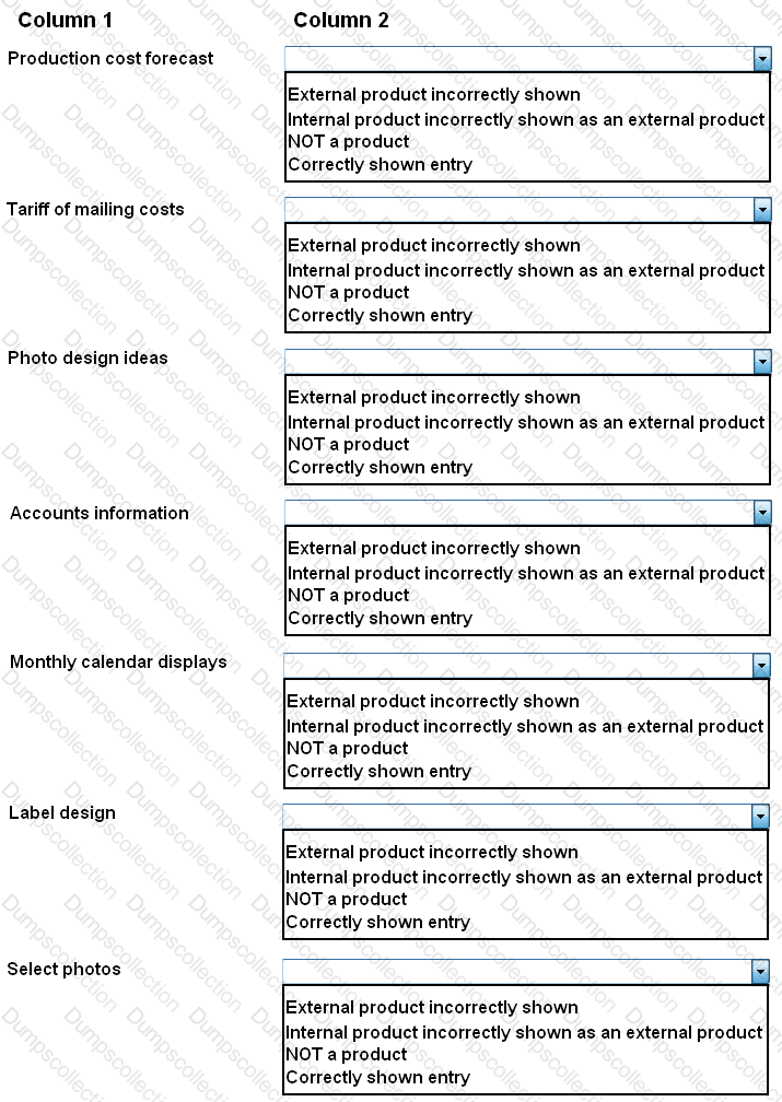 Column 1 is a list of some of the entries in the product breakdown structure. Determine whether each entry in Column 1 has been correctly shown in the product breakdown structure. Select from Column 2 the appropriate statement that correctly describes that entry. Each selection from Column 2 can be used once, more than once or not at all.