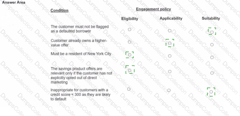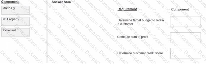 You are a decisioning architect on a next-best-action project and are responsible for designing and implementing decision strategies. Select each component on the leftand drag it to the correct requirement on the right.