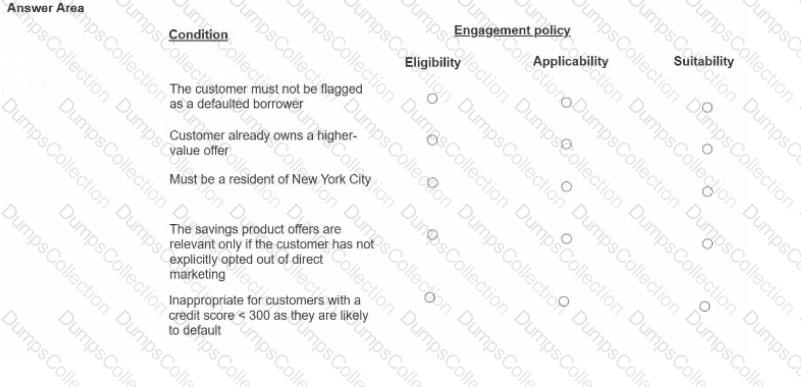 U+ Bank, a retail bank, has recently implemented a project in which credit card offers are presented to qualified customers when they log in to the web self-service portal The Dank added engagement policy conditions to show the offers based on the bank's requirements.