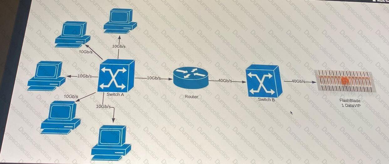 The customer reports that the end clients shown in the diagram are NOT completing jobs on time. Each client writes 300MB/s to the FlashBlade for 45 minutes every hour, and they run concurrently. What does the architect need to do?