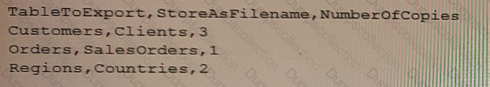A data architect needs to develop a script to export tables from a model based upon rules from an independent file. The structure of the text file with the export rules is as follows: