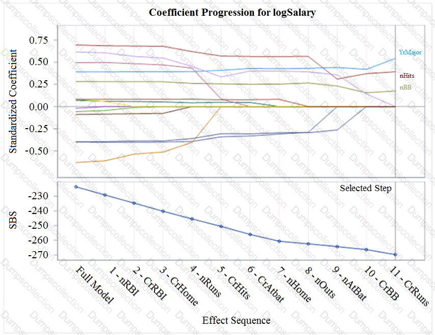 PROC GLMSELECT was used for building a model predicting the natural log of a baseball player's salary from certain performance and longevity statistics. The model used backward elimination using SBC as its selection criterion. The sequence of steps is summarized in the graphic shown below: