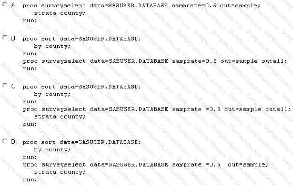 Which SAS program will divide the original data set into 60% training and 40% validation data sets, stratified by county?