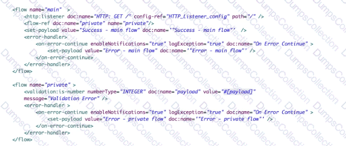 The Validation component in the private flow throws an error. What response message is returnedto a client request to the main flow's HTTP Listener?