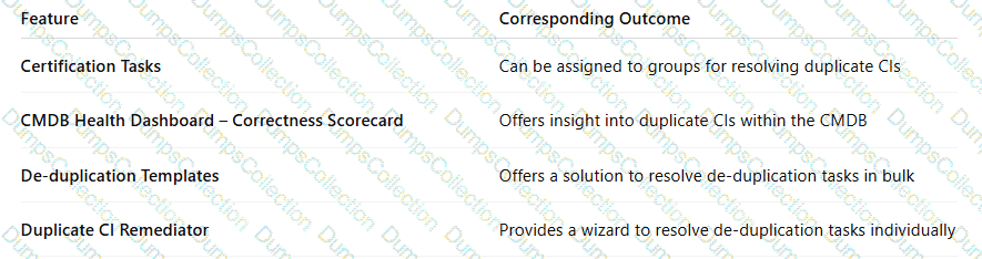 ACMDB Administrator seeks to understand the available tools for preventing addressing, and remediating duplicate CIs Drag and drop each feature with the corresponding outcome Some options may not apply.