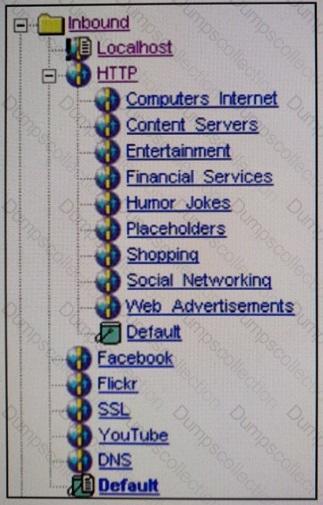 The Global Intelligence Network Of WebPulse service classifies .1 website as "Entertainment; Mumor/tokes." The current configuration of PacketShaper has traffic discovery enabled within the Inbound/HTTP class and has the class tree shownas in the exhibit with WebPulseenabled.