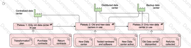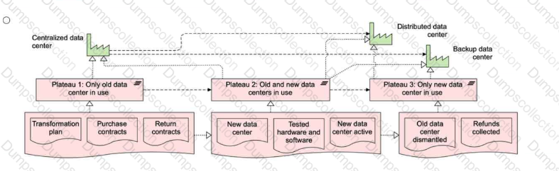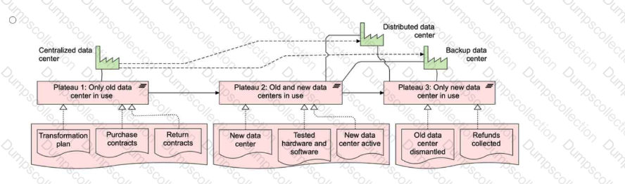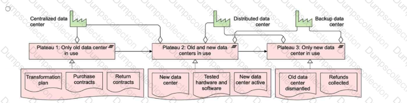 The program manager overseeing the data center transformation has asked you to model an outline of the implementation plan which has three stable states defined. You should show the deliverables associated with each plateau in connection
