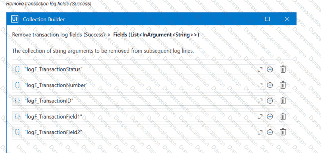 The configuration for Add Log Fields and Remove Log Fields activities are shown below: