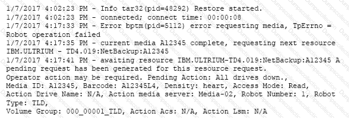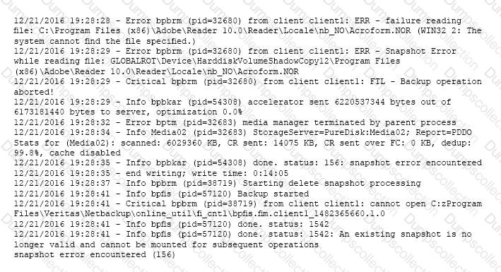 An administrator has a MS-Windows type policy that has failed for a Microsoft Windows NetBackup client. The policy uses the ALL_LOCAL_DRIVES backup selection. See the extract from the end of the job details below: